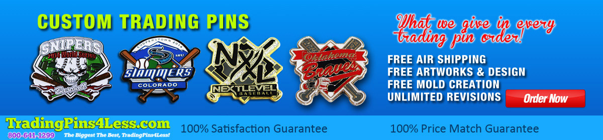 We have carefully selected Trading Pin types and sizes that have historically dominated and continue to rule at Pin Trading events with respect to tradability or "Trading Power". The pin sizes, quantities and styles shown on this site make up the "Sweet Spot" of the Trading Pin market segment. We specialize in all team sports including baseball pins, fast pitch softball pins, soccer pins, hockey pins, umpire and coach pins, Cooperstown pins, Odyssey of the Mind and many others. All of our pins are produced quickly and ship via UPS or FedEx Priority Air Delivery. This service is included in our pricing which some might find unbelievable.